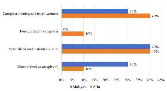 The number of narratives on caregivers in Malaysia is below the Asian average. It is also the only country where the theme of abusive caregivers emerged. Prior research has established that the abuse of older people by caregivers is on the rise in Malaysia—an alarming trend that has resulted in calls to improve legislation to protect older adults from abuse []. Caregiver burden is often a prelude to abusive behaviour [], which signals the importance of programs to support and equip caregivers with skills to manage the onerous task of providing care.