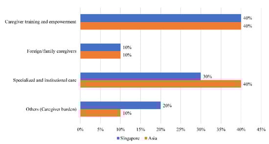 Forty percent (40%) of narratives on caregivers in Singapore (Figure 7) pertained to caregiver training and empowerment (support, training, initiative)—the highest of the six countries. In total, 30% of narratives were regarding specialized and institutional care (voluntary, welfare, center). Another 20% of narratives were on caregiver burden (burden, stress, challenge), and 10% were on family caregivers (parent, compassionate, caring).