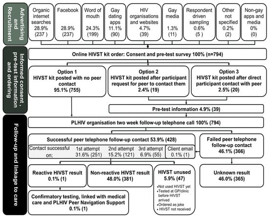 Between December 2016 and April 2018, 794 individuals received 927 HIVST kits (794 first orders, 133 repeat orders). A further 136 orders from interstate and international requests were received during the study period, but were unfilled, as they did not meet the study criteria. Of the 794 first orders, 62% (494) were MSM, 85.3% (677) were cis males, 48% (380) were aged 20–29 years, 38% (305) lived outside a major city, 59% (469) recorded an income of less than AUD50,000/annum, and 10% (81) had no Medicare (National Health Insurance) card. A schematic representation of the study implementation flow and the outcomes of the first ordered HIVST kits (