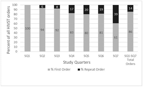 Reasons for choosing to test for HIV using the HIVST kit did not vary by first and repeat orders. Overall, participants reported that the reasons they chose to test for HIV via the online HIVST project were due to convenience (79%; 726), not wanting to wait for results (44%; 402), not wanting to talk about sex with anyone (33%; 298), not having time to go elsewhere for a test (29%; 268), and fear of stigma (22%; 205). Lack of local HIV testing services was reported for 7.2% (66) of orders.