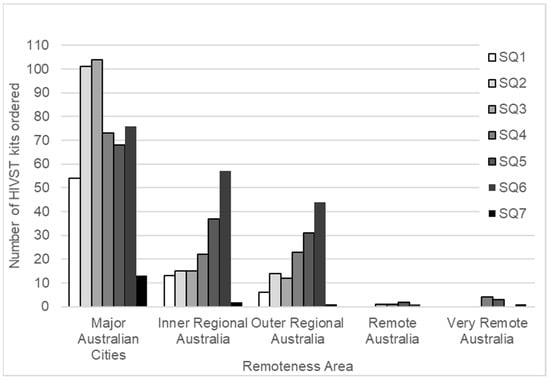 The number of HIVST kits mailed to locations outside major Queensland cities increased during the study period. This was particularly evident for those in Inner and Outer Regional Queensland and correlated with the introduction of geotargeted sponsored Facebook advertising in the last month of study quarter (SQ) 3, with a focus on the Inner and Outer Regional areas of Queensland (