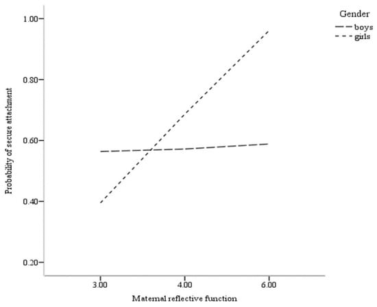 Finally, moderation analysis to evaluate the role of gender in the association between maternal RF and a child’s attachment was accomplished. Results from the PROCESS [34] moderation analyses are displayed in Table 3. The primary focus in the PROCESS moderation model is the coefficient for the product of the independent variable (i.e., maternal RF) and the moderator (i.e., child gender) while accounting for the identified covariates (i.e., child’s age). Results of the final model for attachment security with mother (Nagelkerke R2 = 0.27) indicate a significant maternal RF by gender interaction effect (B = 1.18, p < 0.05). For a significant interaction, PROCESS then provides the conditional effects of the independent variable at each value of the moderator. As displayed in Table 3 and Figure 1, these conditional effects indicated that higher maternal RF evidenced a higher probability for girls to have secure attachment classification (B = 1.18, p < 0.05). Maternal RF was not related to the secure attachment classification of their male child (B = 0.00, p > 0.05).