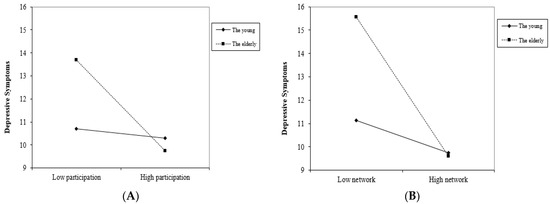 As shown in Model 3, the association between social networks with neighbors and depressive symptoms was more prominent in the older population than in the younger population (β = −1.363, p < 0.05). In addition, the significant link between social participation and depressive symptoms is accentuated for the older group (β = −5.616, p < 0.001). For ease of presentation, Figure 1 displays how the relationships between both neighborhood discussion networks and social participation, as well as depressive symptoms varied among age groups, after controlling for socioeconomic variables. As shown in Figure 1A, social participation was associated with lower levels of depressive symptoms, and this effect was more notable for people who are older. Similarly, Figure 1B suggested that the larger the neighborhood discussion network, the fewer the depressive symptoms. This effect was stronger in the older than the younger group.