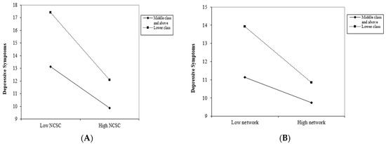 There was a significant interaction effect between socioeconomic status and NCSC on depressive symptoms (β = −0.597, p < 0.01). This indicates that the negative association between NCSC and depressive symptoms was stronger in lower socioeconomic groups than higher socioeconomic groups. The interaction effect between socioeconomic status and neighborhood discussion networks (β = −1.497, p < 0.05) was also significant. As shown in Figure 2, despite trust, reciprocity, perception of social cohesion, and discussion networks being associated with fewer depressive symptoms for all classes, the effect was more prominent for individuals in a lower socioeconomic class than those in the middle class or above.