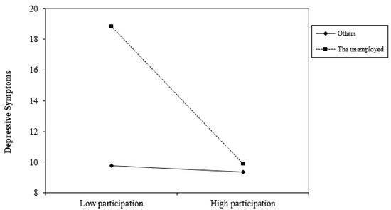 Interaction analysis also showed that social participation was significantly more significant for people who are unemployed (β = −12.301, p < 0.001). This suggests that social participation may play an important role for those who have no work. Unemployment has been confirmed as a significant determinant of depression, mainly through threats to individual identity, and economic pressure [54]. As shown in Figure 3, neighborhood social participation may buffer the typically negative link between unemployment and depressive symptoms.