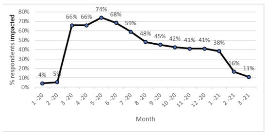 The time horizon for this study were January 2020 through to March 2021. Impact was defined as the wider impact of the pandemic within the individual’s community on their AT use, not on whether or not the individual had contracted COVID-19. Figure 3 demonstrates the percentage of respondents reporting COVID-19-related impacts upon their communities monthly across this period. Factors reported as contributing to reduced impact over time, despite the ongoing presence of the COVID-19 pandemic are reported in the qualitative results.