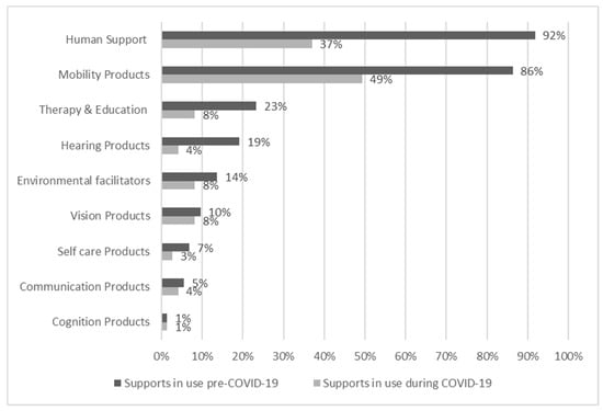Before the pandemic, 47 people (nearly 64%) identified unmet need for AT and related support services, and this impacted both activities and participation. Participants described 188 individual supports in use prior to COVID-19, in contrast to 90 individual supports during COVID-19. Figure 4 depicts a significant overall decrease in the use of support during COVID-19.