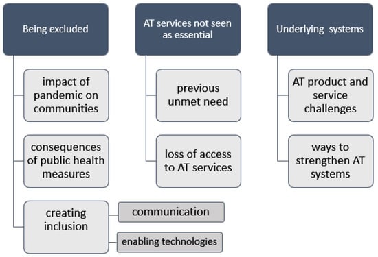 Before COVID-19, all respondents described lives enabled by AT and related supports. The experiences of AT users during the COVID-19 pandemic fell under three broad themes of being excluded from pandemic responses (the impact of pandemic on communities; the consequences of public health measures; and creating inclusion through communication and through enabling technologies); AT services not seen as essential by governments (previously unmet need; loss of access to AT services) and finally, underlying weakness of AT systems (AT product and service challenges, and ways to strengthen AT systems) (see Figure 5). Respondents identified a range of ideas and solutions, contributing to a set of recommendations for AT systems strengthening and these are explored below.