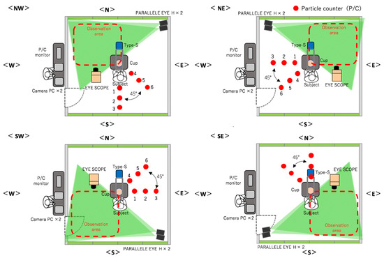 These particles were captured and observed by the P/Cs. Although the particles >5 µm in size reached a peak at 30–60 s from the start, these particles were low in number and were mostly limited to within 50 cm of the operating sites of the devices. By the end of the experiment, no particles were captured by the P/Cs. In the present experiment, the data were obtained by measuring the number of particles that were less than 5 µm in size. Several particles were measured immediately after the micromotor was started, a peak was reached within 100 cm from the workers, and the particles were centered westward (left of the workers) at 30–90 s from the start. At first, more particles were captured in the NE, but over time, they also gradually spread to the SE, reaching a peak after 210 s. The particles that were captured at each of the points reached equilibrium after approximately 300 s, when they were distributed throughout the room (Figure 4).