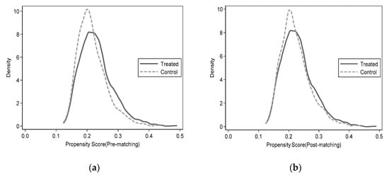The previous study discusses the impact of agricultural land transfers on the multidimensional relative poverty of rural older people and includes variables on individual, household, and social welfare characteristics. However, the previous model may have endogeneity problems due to omitting other variables related to agricultural land transfers. In order to deal with the endogeneity problem and to check the robustness of the model estimates, the propensity value matching method (PSM) is used to match the samples before estimating the measures. Before using PSM for estimation, it is necessary to check whether the sample matching is reasonable and valid. This study uses the more commonly used kernel density function distribution of propensity scores to check the matching before and after matching the treatment group with the control group [52,53]. Figure 2a,b represents the kernel density distribution before and after matching farmland turn-out. From Figure 2, it can be seen that when the nearest neighbor matching method is used (other methods were also tried for matching in this study with similar results), the difference in the probability distribution of the propensity score matching values between the treatment and control groups decreases significantly. The propensity score intervals have a considerable overlap range, and most of the observed values are within the common range. This indicates that the matching method effectively reduces the differences in family characteristics between the treatment and control groups, suggesting that matching is more effective using the nearest neighbor matching method.