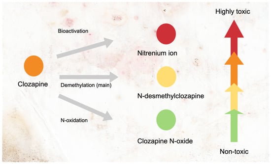 One of the mechanisms that was initially proposed is related to the direct toxicity of clozapine metabolites to the bone marrow stromal cells, in particular the immature neutrophil subpopulation. It is worth noting that, clozapine in its natural form itself is cytotoxic, but only at supratherapeutic levels [9]. The metabolism of clozapine forms at least three different metabolites with distinct cytotoxicity levels (Figure 1). Clozapine N-oxide is a non-toxic metabolite, while N-desmethylclozapine is a less toxic metabolite than clozapine. Both are the products of a cytochrome P450 enzyme (CYP) metabolism, particularly CYP3A4 and CYP1A2 [23].