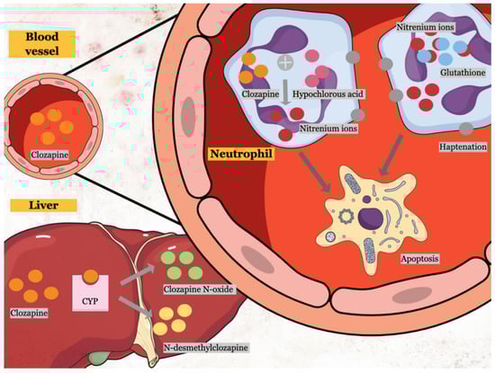 - Williams, D.; Pirmohamed, M.; Naisbitt, D.J.; Uetrecht, J.P.; Park, B.K. Induction of Metabolism-Dependent and -Independent Neutrophil Apoptosis by Clozapine. Mol. Pharmacol. 2000, 58, 207–216. [Google Scholar] [CrossRef]