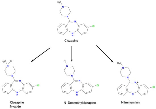 - Liu, Z.C.; Uetrecht, J.P. Clozapine is oxidized by activated human neutrophils to a reactive nitrenium ion that irreversibly binds to the cells. J. Pharmacol. Exp. Ther. 1995, 275, 1476–1483. [Google Scholar]