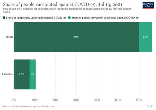 Share of People Vaccinated Against COVID 19, 13 July 2021 for Israel and Palestine [8], used under Creative Commons License CC BY 4.0.