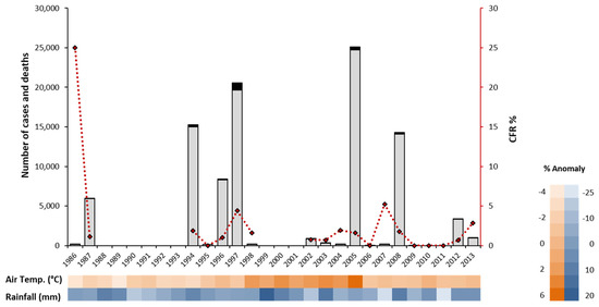 Number of cholera cases, deaths, and case fatality rate (CFR) in Guinea-Bissau between 1986 and 2013, from the WHO weekly epidemiological reports. Bar height corresponds to the total number of cholera cases reported; black portion of the bars corresponds to number of deaths. The red dashed line corresponds to the CFR percentage. Heat map (ascending color gradient) showing air temperature (orange, annual average range 27.69–30.57 °C) and rainfall (blue, annual average range, 844–1345 mm) deviation to the 27-year time series average.