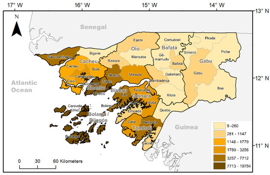 Geographical distribution of cholera cumulative incidence per 10,000 inhabitants by sector level in Guinea Bissau, 1986−2013. Source: Cholera Platform. (http://www.plateformecholera.info/attachments/article/231/GNB_incidence%20map_PhatChol.pdf, accessed on 7 September 2020).