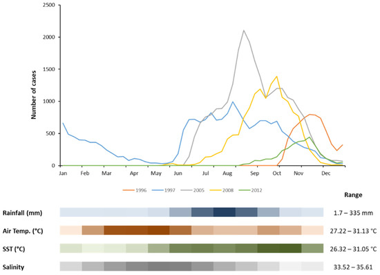 The 1994 epidemic (moderate El Niño year) started in October, after 4 months of water temperatures above 29 °C and when salinity decreased below 34, and conditions were favorable for the survival of V. cholerae in coastal waters. The epidemic started by the end of the wet season, following 5 months of heavy downpour, with rainfall above the climatological average for the start month and the previous one (20 and 28%, respectively). The same conditions were verified in the following 1996 epidemic (a moderate La Niña year), with the exception that the amount of rain observed was not above the climatological average, but the air temperature was slightly (1%) above average in the month preceding the onset. The 1997 epidemic (a very strong El Niño year) started in the aftermath of the previous one, simultaneous to the onset of the wet season, whose rainfall amount in May was above the climatological average by 106%. The major epidemic of 2005, a weak El Niño and La Niña year, emerged in June during the third consecutive month of climatological water temperatures above average (6, 6, and 3%, respectively) and salinity marginally below average. Additionally, the recorded air temperature was above climatological average (up to 7%) since the beginning of the year, and rainfall was 54% above average in the month previous to the onset, and about 9% for June. The 2008 epidemic (a strong La Niña year) had its beginning in May, the hottest month of that year, with air temperatures averaging 31.4 °C (about 1% above the climatological average) and water temperatures also above average since the beginning of the year (up to 5%). Again, the onset coincided with the beginning of the wet season, with rainfall above average by 9% for that month.