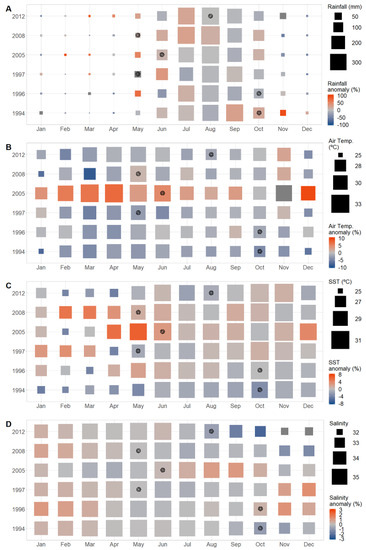 Sea surface and air temperature are reported in degrees Celsius; salinity in the dimensionless practical salinity scale, defined as conductivity ratio; and rainfall in mm. The annual average dataset of each environmental parameter is shown in Table S1.