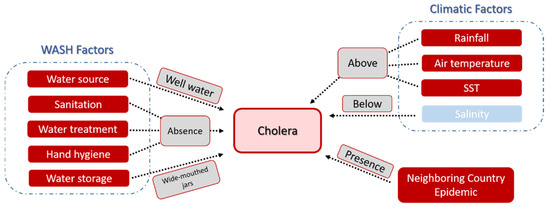 - Jones, N.; Bouzid, M.; Few, R.; Hunter, P.; Lake, I. Water, sanitation and hygiene risk factors for the transmission of cholera in a changing climate: Using a systematic review to develop a causal process diagram. J. Water. Health 2020, 18, 145–158. [Google Scholar] [CrossRef] [Green Version]