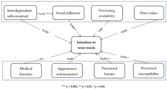 The mean, standard deviation, and correlation coefficient of each variable are presented in Table 2. There was a significant positive correlation between appearance enhancement (r = 0.162, p < 0.05), social influence (r = 0.440, p < 0.05), interdependent social construal (r = 0.185, p < 0.05), and intention to wear the mask, while the correlation between perceived susceptibility and future mask prediction was negative. The other three independent variables, namely, facilitating condition, price value, and medical function, were not significantly correlated with the dependent variable. However, the effect of independent variables on dependent variables requires more specific regression tests.