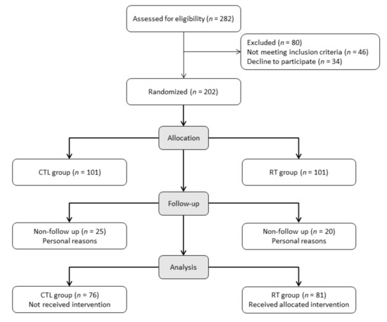 Initially, 202 male and female patients were randomized into two groups through a simple random number generation and allocated to the control group (CTL) and resistance training group (RT). Forty-five patients decline to participate due to personal reasons, among them twenty-five from the CTL group and twenty from the RT group. Finally, the total sample size was 157 patients (CTL, n = 76 and RT, n = 81) who participated in the present study. Women enrolled in this study were at the postmenopausal stage without any hormonal therapy. The numbers of women per group were CTL group (n = 36) and RT group (n = 35). Figure 1 presents the participants flow-chart.