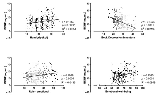 Spearman’s correlation with pooled groups (n = 157). Correlations between BDNF (ng/mL), handgrip (kgf), Beck depression inventory, and both dimension the emotional role and emotional well-being.