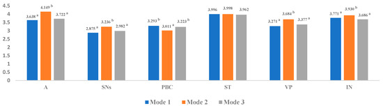 Differences of each variable under different pro-environmental publicity modes. Note: In each variable, no significant difference is found between the two groups of values with the same superscript, the two groups with different superscripts have significant differences, and the group of superscript b is larger than that of superscript a.