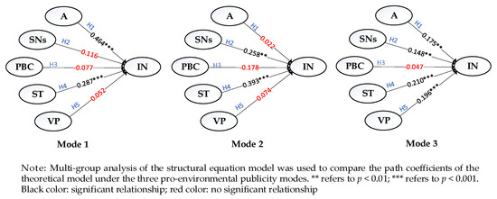 - It can be seen from the above results that the path coefficient of the model is different among the three pro-environmental publicity modes. Hypothesis 6 is supported.