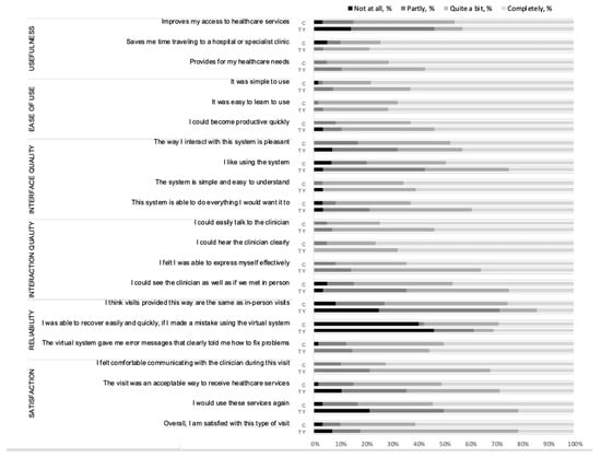 - Parmanto, B.; Lewis, J.A.N.; Graham, K.M.; Bertolet, M. Development of the Telehealth Usability Questionnaire (TUQ). Int. J. Telerehabilitation 2016, 8, 3–10. [Google Scholar] [CrossRef]