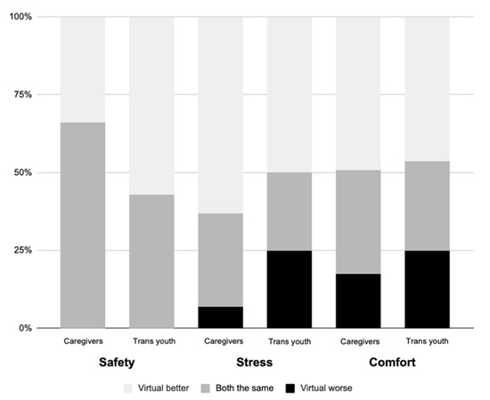 Silva, C.; Fung, A.; Irvine, M.A.; Ziabakhsh, S.; Hursh, B.E. Usability of Virtual Visits for the Routine Clinical Care of Trans Youth during the COVID-19 Pandemic: Youth and Caregiver Perspectives. Int. J. Environ. Res. Public Health 2021, 18, 11321. https://doi.org/10.3390/ijerph182111321