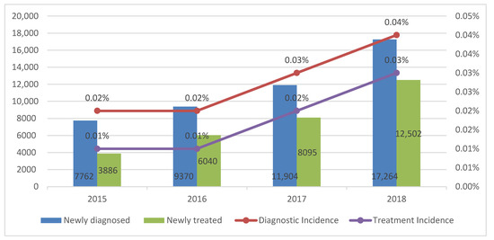 The male predominance decreased during the study period in both the diagnosed (1.83 in 2015; 1.45 in 2018) and treatment population (1.74 in 2015; 1.39 in 2018). This finding is consistent with the published results [22].