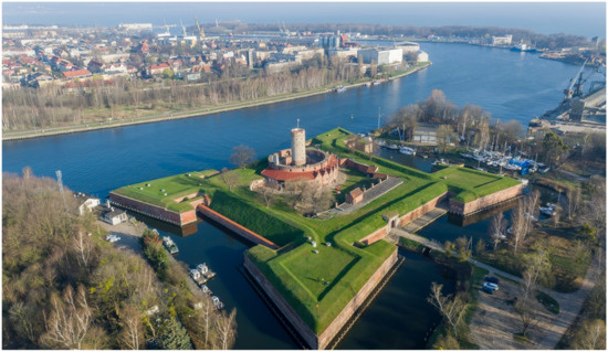 Natura 2000 is a complex of protected crucial nesting and breeding sites for threatened and rare species, as well as rare natural habitats. This network extends across all 27 EU countries, on both land and sea [37]. In 2018, the Wisłoujście Fortress complex was also proclaimed to be a Historic Monument—an object of the cultural heritage of Poland [38,39]—as one of the largest preserved, most outstanding works of military architecture, unique in terms of its location, spatial layout, and applied architectural and technical solutions.