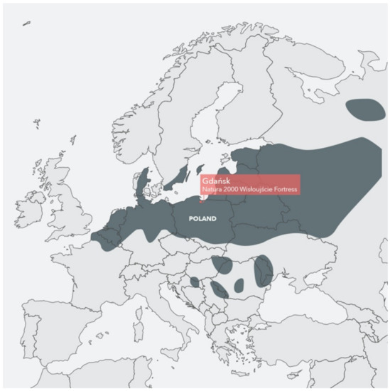 The main study area (Figure 1) represents the Natura 2000 Wisłoujście Fortress complex (54°23′41″ N 18°40′51″ E) [34]. This historic structure is located in Gdańsk, Poland, by an old estuary of the river Vistula, which flows into the Bay of Gdańsk (Figure 2). It was erected at the end of the 15th century to secure the entrance to the port of Gdańsk from the sea, and continual extensions and modifications were made until the second half of the 19th century. Built from brick and earth fortifications and surrounded by old trees and moats filled with water, it is recognised as the only historic maritime defence complex on the entire coast of the Baltic Sea. The main architectural feature Fort Carré is a square-shaped brick fort with a tower and four domed bastions at the corners. It is also one of the largest wintering grounds for bats in the Pomeranian Voivodeship, with canals and moats adjacent to the fortress providing optimal foraging grounds. For many years, this site, including the fortress complex, has also been the hibernation ground for many rare bats, including the pond bat (Myotis dasycneme) which is on the International Union for Conservation of Nature Red List of Threatened Species (IUCN) [35]. In 2004, due to the regular presence of this rare bat (from September to March), this area was entered into the European ecological network “Natura 2000” as a Special Protection Area [36].