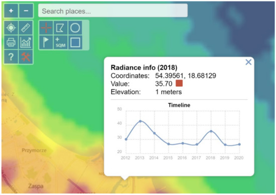 In the first stage, a visual analysis was performed on light pollution maps for the years 2012–2020 in the area of the Wisłoujście Fortress and surrounding areas, based on the LPM service. A composition was made of screenshots taken in the same terrain location. This composition included maps for individual years. The next step was to analyse the data provided by the web portal. For this, an extended tool from the “Toggle extended toolbar”—“Point information” group was used. Figure 5 shows the available options. After moving the cursor over the graph, individual radiance values for a given year were read in the indicated place. The data that were interpreted in this way were tabulated for 7 points (point 1—Wisłoujście Fortress, points 2–6—the surrounding areas). Table 1 shows the coordinates of the analysed points.