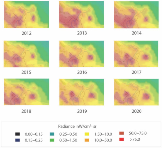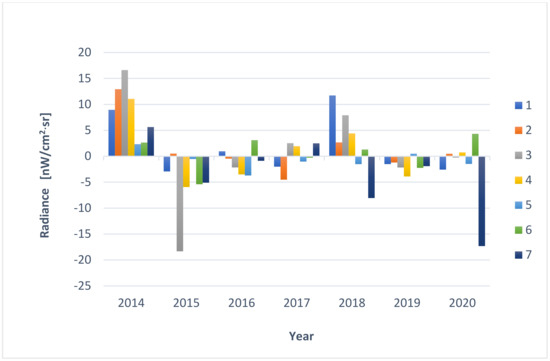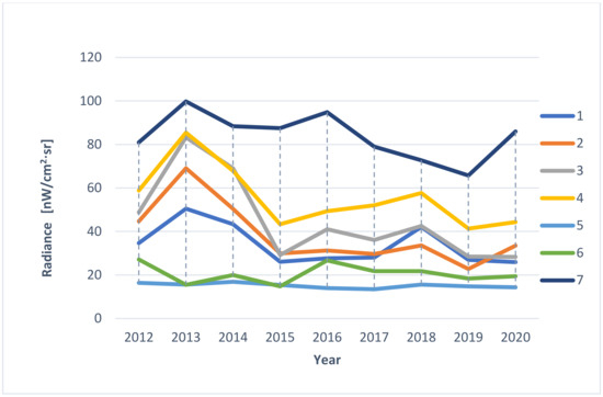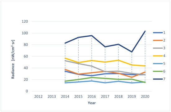 Additionally, relevant data provided by the second service were compared using https://lighttrends.lightpollutionmap.info/ (accessed on 5 May 2021). For this part of the analysis, the “Analyse data by selecting pixel” tool was used. After clicking on the selected place, a graph of radiance data was generated for the period 2014–2020 for the selected point. The collected data were compared for the indicated 7 points.