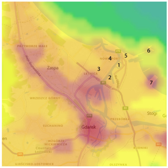 Two areas were analysed with the help of the image processing and matrix analysis tool available in MATLAB 2020b. The first was the area of 9 pixels which coincided with the Wisłoujście Fortress. The second was an area with 1296 analysed pixels located deeper into Gdańsk (south-west).