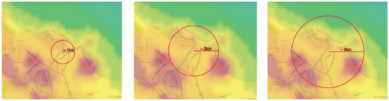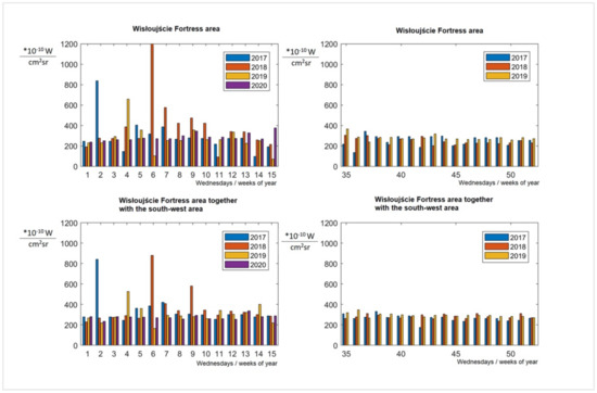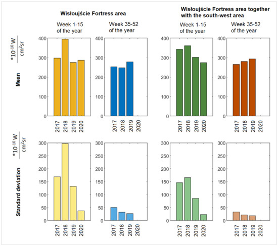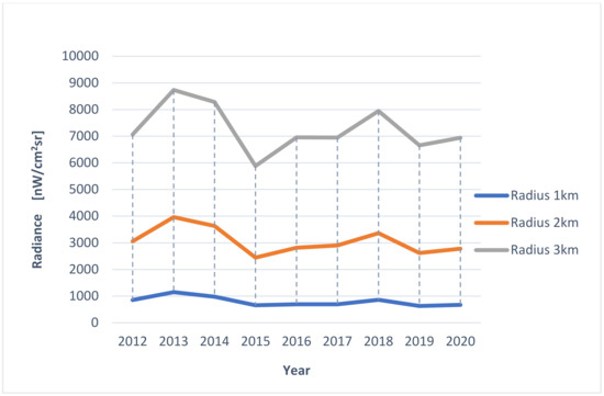 In order to verify the averaged situation regarding the light pollution that impacts the Natura 2000 Wisłoujście Fortress site, an analysis of radiance changes during 2012–2020 was performed in areas indicated by a circle with a radius of 1 km, 2 km, and 3 km, with the Wisłoujście Fortress at its centre. The results were also tabulated and are commented on in Section 5 of this article. For this purpose, the “Area (circle) statistics and data export” tool on the LPM web portal was used.