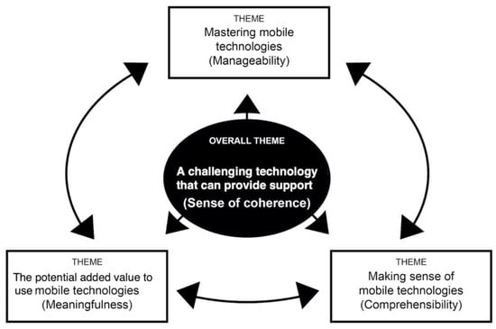 The transcribed interviews were read to gain a general sense of the whole and units of analysis responding to the aim of the study were marked. The analysis was based on the SOC to understand the participant’s use of mobile technologies. To analyze the experiences, the units of analysis were grouped using a matrix as described by Elo and Kyngäs [23]. The matrix was employed to sort the data corresponding to each central component in the theoretical SOC model: comprehensibility, manageability, and meaningfulness [17,18]. These three areas were subsequently analyzed thematically, following the six phases described by Braun and Clarke [29]. The six phases were as follows: (i) familiarization with the transcribed interviews; (ii) generation of initial codes from the units of analysis; (iii) creation of subthemes of the codes and the relationships among them; (iv) review of the themes corresponding to the description of the three components of the SOC theoretical model; (v) defining and naming the themes; and finally (vi) production of the report. Phases one and two were conducted in parallel with the deductive coding. The analysis was conducted by moving back and forth between the phases as needed. All the authors carried it out to obtain consensus in sorting the data into related themes according to the descriptions of the SOC model components. The analysis ended with the creation of a thematic map explaining the interrelations between the overall theme and the different themes corresponding to the SOC model.