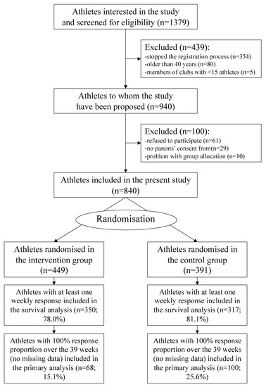 The inclusion of athletes in the study was performed electronically, during a two-week period (from 23 October 2017 to 6 November 2017), based on the following criteria: athletes must be licensed at the FFA in a club of at least 15 athletes (i.e., included cluster), without any contraindications for competitive athletics activity attested by the license at the FFA, aged between 15 to 40 years, and having access to the Internet. We excluded athletes if they declined to participate in the study or if they were unable to express agreement or signing the informed consent. We did not exclude athletes based on their baseline injury status or history [10].
