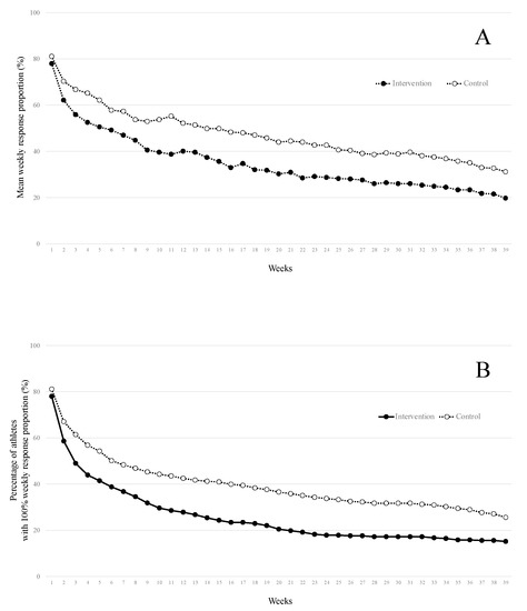 The evolution of (A) the mean weekly response proportions and (B) the percentage of athletes with 100% of response proportions in the intervention and the control groups over the 39 weeks of follow-up.