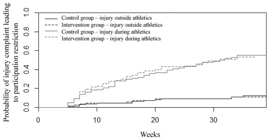 Finally, we used a survival analysis to evaluate the time to the first ICPR. For athletes who reported no ICPR during athletics practice, we censored them (1) at the time of their last questionnaire submission in case they stopped completing the weekly questionnaire, (2) when they had a ICPR that occurred outside of athletics practice, or (3) at the end of the study (40 weeks) if they submitted all questionnaires and had no ICPR outside of athletics. First, we carried out a competing risk analysis (using R package “cmprsk”) to determine whether there were significant differences between the control and intervention groups in terms of the cumulative incidence of ICPR occurred during athletics and outside of athletics [18]. Second, we adjusted a Cox proportional hazards model and followed the variable selection process described above.