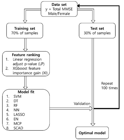 Schematic diagram of the proposed procedure. The abbreviations in the figure are: mini-mental state examination (MMSE); support vector machine (SVM); decision tree (DT); random forest (RF); neural network (NN); least absolute shrinkage and selection operator (LASSO); elastic net (EN); minimax concave penalty (MCP); smoothly clipped absolute deviation (SCAD).