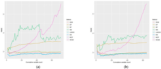 Considering the distribution of the cumulative feature RMSE based on the LP and XI ranked data for men, SCAD did not exhibit a constant trend, and its value soared. SVM, RF, LASSO, EN, and MCP exhibited similar RMSE distributions, and EN and LASSO had the lowest RMSE values.