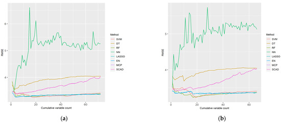 Considering the distribution of the cumulative feature RMSE based on the LP and XI ranked data for women, NN had a distinct pattern and its RMSE was relatively higher than that of other ML models. DT and SCAD had a relatively high RMSE, and SCAD exhibited a pattern wherein the RMSE increased as the features accumulated. SVM, RF, LASSO, EN, and MCP exhibited similar RMSE distributions, and SVM and RF had the lowest RMSE values.