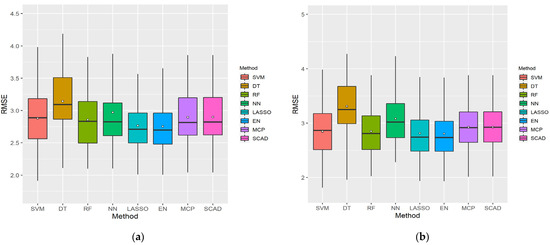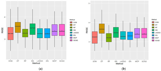 Figure 4 presents boxplots using 100 sampled datasets for cumulative variables with the lowest RMSE in each ML method, considering the LP and XI ranked datasets for men. As shown, DT exhibited a wide RMSE distribution and had the highest error value, whereas EN exhibited a small RMSE distribution and had the lowest error value. SVM had the lowest minimum RMSE values in both cases.