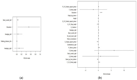 Estimated representation of the coefficients of the optimal model considering the regression coefficient intervals (RCIs) for (a) men and (b) women. The x-axis represents the regression coefficient interval. The y-axis represents the significance of five functions selected from the EN of the LP data for men and twenty functions selected from the SVM of the XI data for women.