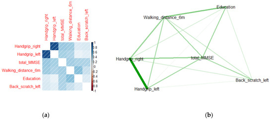 (a) Correlogram and (b) network analysis of the five optimal features for men. In the correlogram, the blue area represents a positive correlation and the red area represents a negative correlation. The right bar represents the correlation, ranging from −1 to 1. In the network analysis diagram, the green lines represent positive relationships.