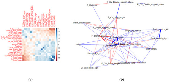 (a) Correlogram and (b) network analysis of the 20 optimal features for women. In the correlogram, the blue area represents a positive correlation and the red area represents a negative correlation. The right bar represents the correlation ranging from −1 to 1. In the network analysis diagram, the blue lines represent positive relationships and the red lines represent negative relationships.