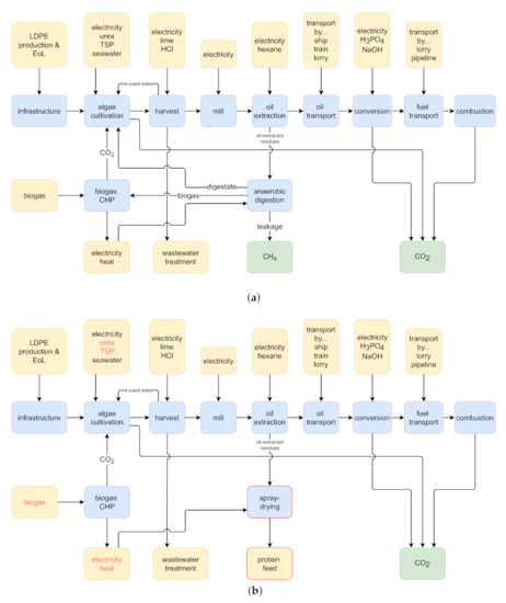 Scheme of the two studied algal fuel co-production systems. Yellow—background system; green—biosphere; blue—foreground system; red frame—process newly introduced in AF + fodder system; red font—identical process in both systems but with different flow amount. Abbreviations: LDPE—low density polyethylene; EoL—end of life; TSP—triple superphosphate; CHP—combined heat and power plant. (a) AF + energy system (adapted from [31]). (b) AF + fodder system.