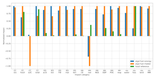 Comparison of environmental impacts: AF + energy (blue), AF + fodder (orange), and petroleum diesel (green). Note that the bars are normalized by the maximum in each category. Abbreviations: CC—climate change; EQ—ecosystem quality; HH—human health; res—resource depletion; bio—biogenic; LUC—land use and land use change; acid—freshwater and terrestrial acidification; tox—freshwater ecotoxicity; FW—freshwater eutrophication; mar—marine eutrophication; terr—terrestrial eutrophication; CE—carcinogenic effects; rad—ionizing radiation; NCE—non-carcinogenic effects; ODP—ozone depletion potential; POC—photochemical ozone creation; resp—respiratory effects; water—water dissipation; foss—fossil; land—land use; MM—minerals and metals.
